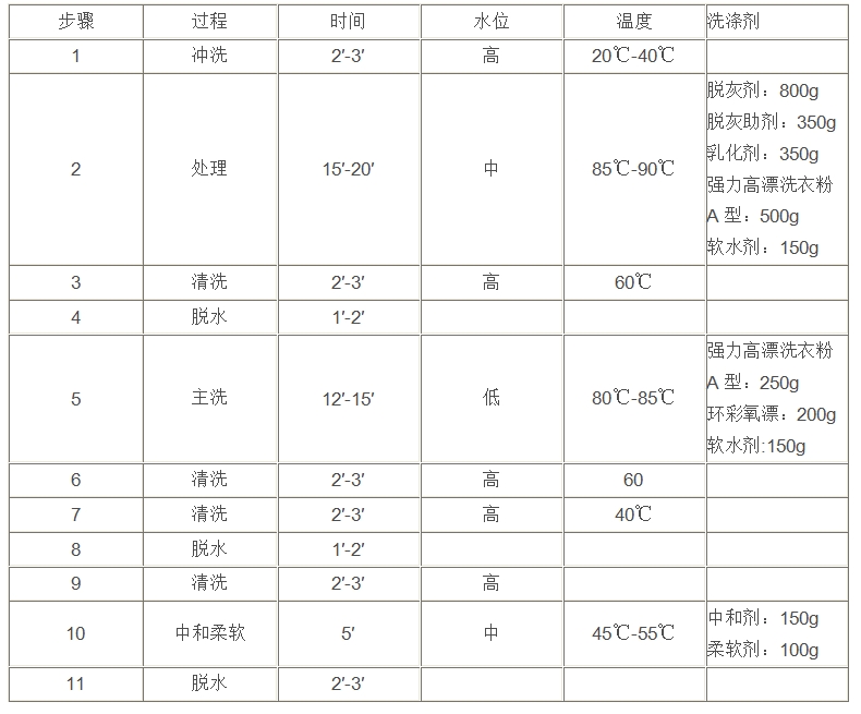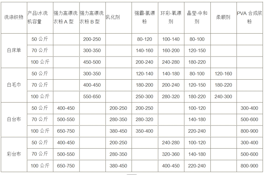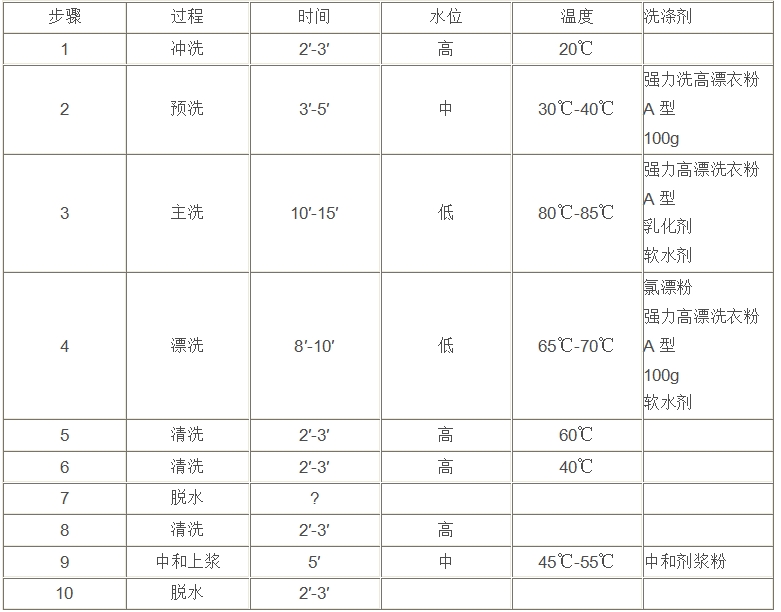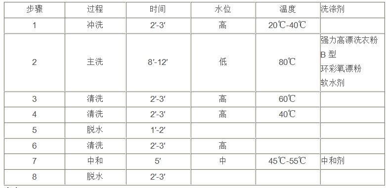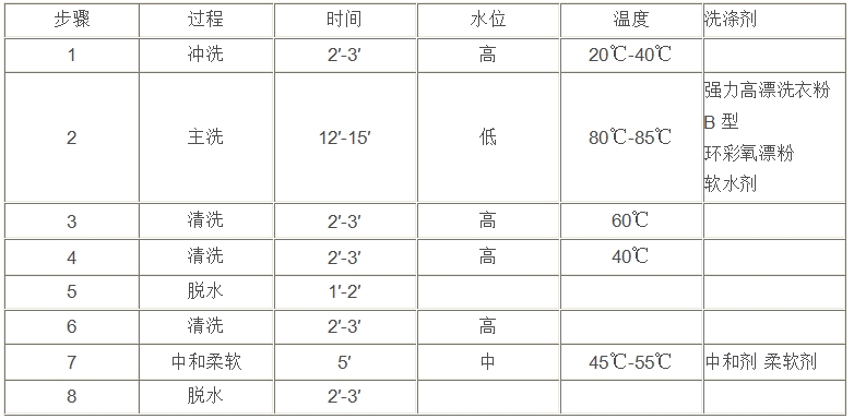 說明:以上用量僅供參考,需根據(jù)使用情況加以調(diào)整;在洗滌床單和毛巾時,可根據(jù)情況選擇使用氯漂或氧漂;清潔劑的用量需要檢查洗滌效果與檢測洗液濃度兩方面的數(shù)據(jù)來確定。